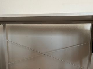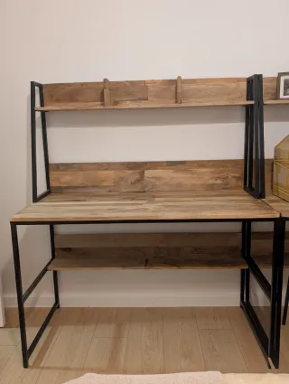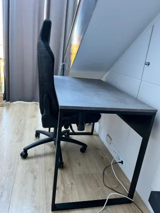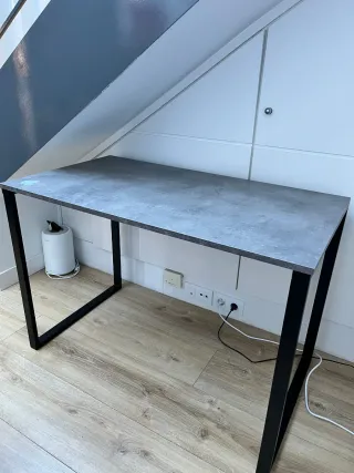 Escritorio de estilo moderno con un acabado limpio, muy robusto y resistente. Esta en buen estado, tiene una marca desde el inicio por una punta que no pusimos bien en el montaje ( he adjuntado foto). Y luego alguna marca de uso en la esquina de la mesa (también en las fotos) - dos cajones amplios para almacenamiento. - Patas metálicas resistentes.