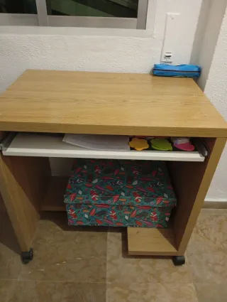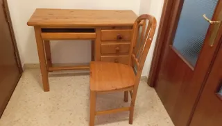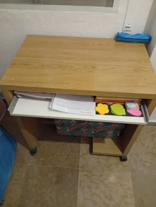 Conjunto de escritorio IKEA en buen estado, ideal para tu espacio de trabajo o estudio. Incluye una práctica cajonera y una silla.Solo tiene unas pequeñas manchas en el tablero de la mesa.No hago envios. Ancho escritorio:60cm Largo. ". :1,40cm Altura: patas regulables - Escritorio con tablero de madera. - Cajonera de tres cajones. - Silla con ruedas.