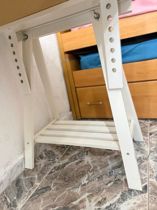 Escritorio de Ikea con diseño reclinable. - Patas en forma de caballete con estantes. - Altura ajustable en las patas.