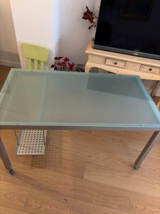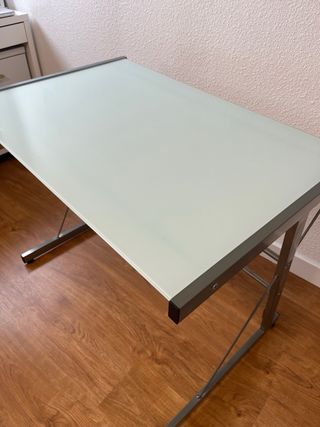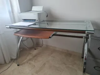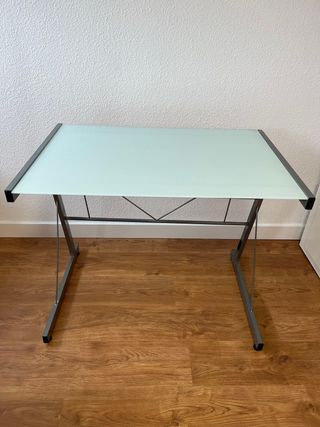 Práctico escritorio con superficie de cristal y estructura metálica. - Diseño moderno y minimalista. - Patas metálicas resistentes. En buen estado