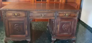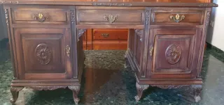 Elegante escritorio antiguo con un diseño clásico y detalles ornamentales. - Elaborado en madera de alta calidad. - Presenta un acabado envejecido que le confiere carácter. - Cuenta con cajones y compartimentos para almacenamiento. - Patas talladas con un estilo barroco.