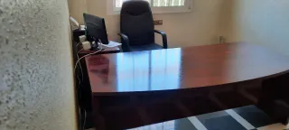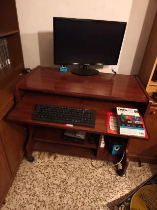 Escritorio de madera con un diseño clásico y funcional. - Acabado en tono marrón oscuro. - Amplia superficie de trabajo. - Estructura robusta.