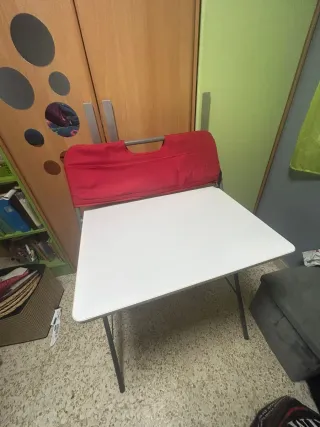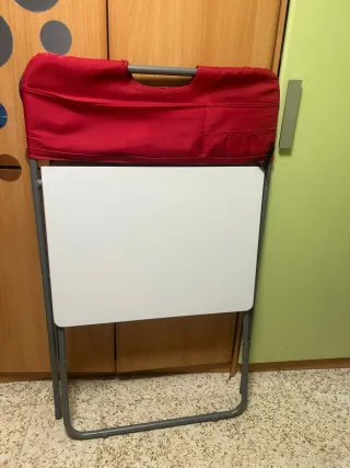 Práctico escritorio plegable con un diseño moderno. - Estructura metálica resistente. - Superficie de trabajo blanca. - Funda superior roja con compartimentos.
