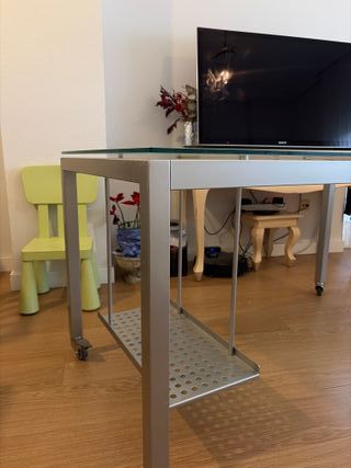 Elegante mesa de escritorio con superficie de cristal y estructura metálica. - Diseño moderno y funcional. - Patas con ruedas para fácil movilidad.