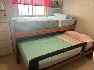 Cama nido con un diseño funcional y práctico. Incluye mesas integradas para mayor comodidad, 4 cajones para almacenaje y los 2 somieres de láminas. Tiene un pequeño desperfecto de descascarillado en la estructura de la cama baja. Desmontaje y recogida por parte del cliente - Estructura principal de madera. - Mesas auxiliares que se recogen en la misma estructura de la cama. - 4 Cajones con profundidad del fondo de la cama. - No incluye colchones ni barrera anti caída de niños.