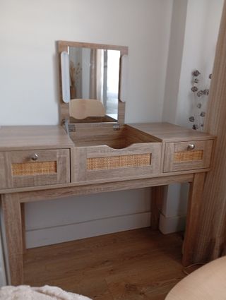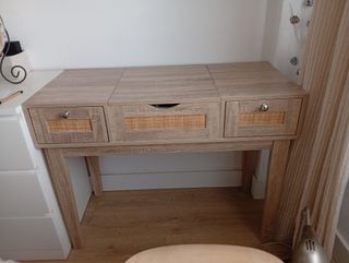 Elegante tocador que también puede funcionar como escritorio, con un diseño moderno y materiales de calidad. - Acabado en madera clara. - Detalles en ratán. - Tres cajones frontales.