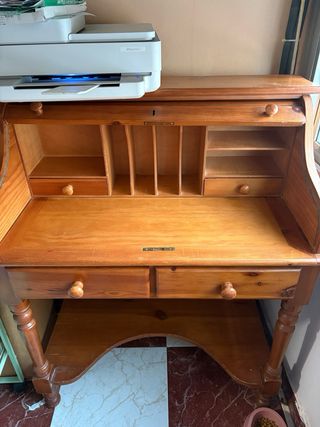 Escritorio de madera con un diseño clásico y elegante. - Tapa abatible con cerradura. - Tres cajones amplios. - Tiradores de diseño. -Organizador en la parte de escritura