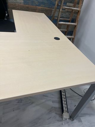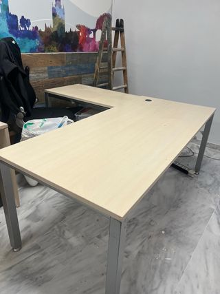 Mesa de escritorio en forma de L, ideal para despachos u oficinas. Su diseño combina la calidez de la madera con la robustez del metal. - Superficie de madera clara. - Estructura metálica gris. - Forma de L para optimizar el espacio.