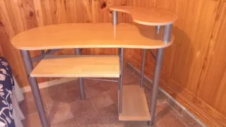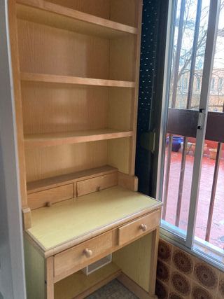 Práctico escritorio de estudio con estantería superior. - Diseño moderno y funcional. - Amplia superficie de trabajo. - Compartimentos de almacenamiento integrados. SOLO VENTA EN PERSONA