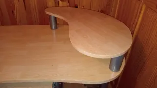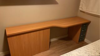 Escritorio con un diseño tradicional y funcional, perfecto para tu espacio de trabajo o estudio. Su superficie amplia ofrece comodidad para tus tareas diarias. - Superficie de madera en tono natural. - Mueble lateral con cuatro cajones en color azul. - Diseño curvo en un extremo de la mesa (profundidad de 550cm en un lado y 320cm en el otro lado) Desmontaje por parte del comprador