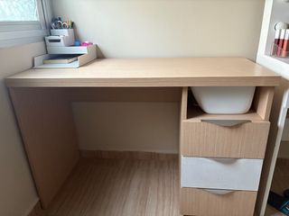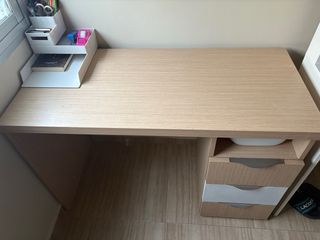 Escritorio funcional con un diseño moderno. - No hago envío - Estructura principal en madera clara. - Cajones en blanco y madera. - Compartimento abierto superior.