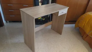 Escritorio de madera con un diseño moderno y líneas sencillas. Cuenta con un cajón para almacenamiento. Está en perfectas condiciones (quizás una minimisima mariquita de haberse usado, para ser super honesta, pero totalmente mínima) - Tablero con bordes redondeados. - Patas cónicas. - Cajón integrado.