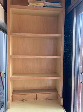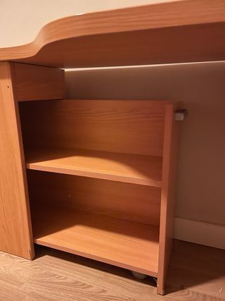 Escritorio funcional con estantería integrada. Ideal para organizar tu espacio de trabajo o estudio. - Diseño en madera clara. - Estantería con varios niveles. - Cajones inferiores para almacenamiento.