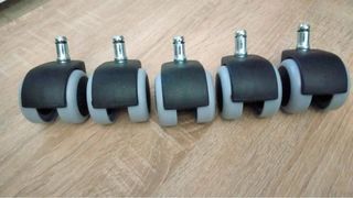 Conjunto de cinco ruedas de repuesto para sillas de escritorio. Diseñadas para facilitar el movimiento y la comodidad. - Fabricadas con materiales duraderos. - Diseño moderno en negro y gris.