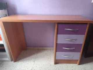 Escritorio juvenil con un diseño moderno y funcional. Hecho a medida y personalizado. Se entrega montado. - Tablero de madera. - Cajones en tonos morado y lila. - Tiradores metálicos.