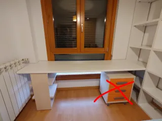 2 ESCRITORIOS con 6 patas y 2 cajoneras ( gris oscura rayada en la encimera pero cajones nuevos y blanca nueva completamente) ...la gris, la utilizaba a modo de pata por eso está rayada... Como soporte para los tableros. (Dos tableros 75X150 + 6 patas + 2cajonera negra y blanca nueva) Todo por 190 euros