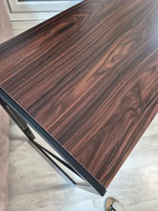 Preciosa mesa de escritorio de la marca Furinno. Es compacta y elegante. - Superficie de trabajo amplia. - Estante lateral para accesorios. - Estructura metálica resistente. - Acabado en madera oscura.