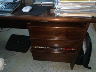 Mesa de despacho o estudio de madera en color marrón. Está en buen estado, aunque presenta algunas señales de uso. - Medidas: (Añadir medidas) - Tres cajones - Diseño curvado