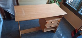 Mesa de estudio o trabajo con un diseño sencillo y funcional. Perfecta para organizar tu espacio. - Acabado en madera clara. - Cuenta con dos cajones. - Espacio inferior abierto para almacenamiento. -Presenta algunos signos de desgaste. -Madera clásica super resistente no conglomerado tipo Ikea.