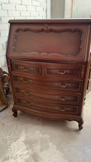 Elegante escritorio antiguo con un diseño clásico y funcional. - Fabricado en madera de alta calidad. - Acabado en tono marrón cálido. - Cuenta con varios cajones y compartimentos. - Detalles ornamentales en los laterales y la parte superior.