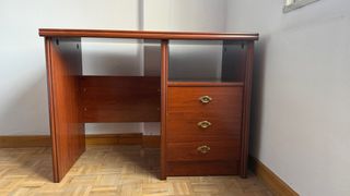 Escritorio de madera con un diseño clásico y funcional. Con tres cajones a la derecha en buen estado - Tres cajones con tiradores dorados. - Compartimento abierto superior. - Estructura robusta.
