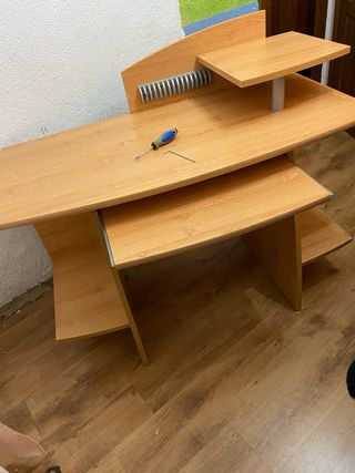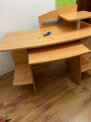 Escritorio con un diseño moderno y funcional. - Superficie de madera en tonos beige y marrón. - Estructura de metal. - Bandeja extraíble para teclado. -Desmontado