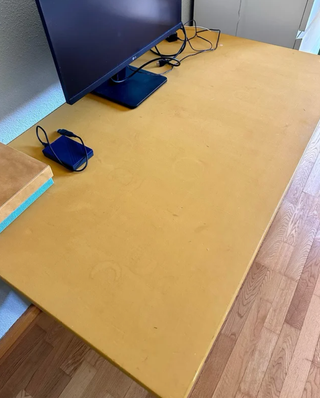 La marca la he puesto al azar. Es una mesa perfecta, espaciosa y sencilla. Tiene una pequeña marca en una de las esquinas porque se me cayó el tablero cuando la monte... Por lo demás está como nueva. Mesa de escritorio espaciosa con un diseño moderno. - Tablero de madera en tono claro. - Patas de metal resistentes.