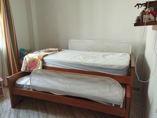 Conjunto de dormitorio madera compuesto por estructura cama nido doble, estantería y escritorio. En muy buen estado.