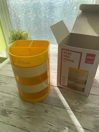 Organizador de escritorio Deli, ideal para mantener tu espacio de trabajo ordenado. Es de plástico, amarillo y blanco, y tiene un diseño moderno y atractivo. - Perfecto para organizar bolígrafos, lápices y otros artículos de escritorio. - Diseño de 4 compartimentos(cajones) - Medidas: 85x85x90mm