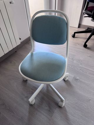 Silla de escritorio para niños con un diseño moderno y funcional. - Asiento y respaldo tapizados en tela azul. - Estructura y base de metal blanco. - Base con ruedas para facilitar el movimiento.
