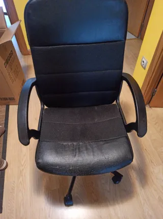 Silla de estudio oficina. Con evidentes signos de desgaste, y las ruedas desgastadas. Es muy cómoda y aún puede hacer su papel.