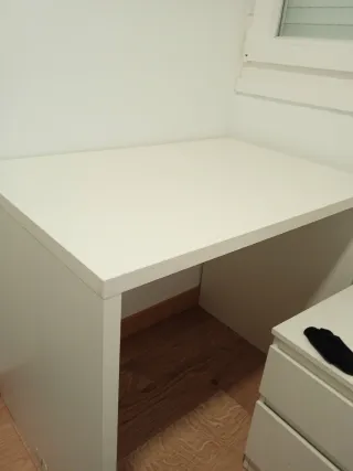 Escritorio moderno de color blanco, ideal para cualquier espacio. - Cuenta con dos cajones con tiradores metálicos. - Amplia superficie de trabajo. - Diseño funcional. Tiene 2 accesos hechos por detras de la mesa y por arriba para pasar cables en caso de apoyar un ordenador que los cables no se vean tanto Tiene un desgaste notorio a la altura de la derecha por el roce con el apoyabrazos de la silla Ofrezco servicio para llevarla hasta el portal del destinatario ( no lo subo al hogar) por 30€ aparte Mide uno aprox 150cm de largo, 70 de alto y pesa cerca de los 100 y poco