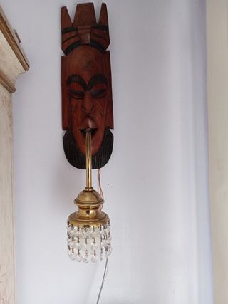 Aplique realizado con el reciclaje de una máscara étnica tallada a mano y una tulipa de lampara antigua. Ideal para decorar cualquier rincón de casa dándole un toque original . El precio es sin la bombilla. Medidas aproximadas 56cm alto x 12cm ancho x 15cm profundidad. Más modelos en mi perfil. retro vintage moda mueble madera bronce metal escultura figura artesanía decoracion salón comedor habitación bufett armario iluminación antiguo jardinera macetero pedestal columna herrajes santo escapulario virgen Jesús ángel