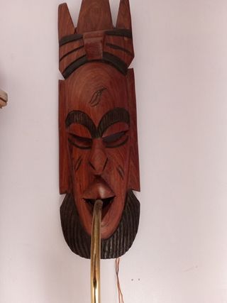 Lampara pared realizada con el reciclaje de una mascara etnica tallada y pintada a mano y dos tulipas de una lampara de los años 70 del siglo pasado , por lo que es exclusiva y única . Ideal para cualquier rincón de casa dándole un toque original y divertido . Las bombillas no están incluidas en el precio . Medidas aproximadas 56cm alto x 27cn ancho x 15cm profundidad. Más modelos en mi perfil. Retro vintage moda mueble madera bronce metal escultura figura artesanía decoración salón comedor habitación armario iluminación antiguo pedestal columna herrajes lampara aplique pared relicario Virgen Jesús
