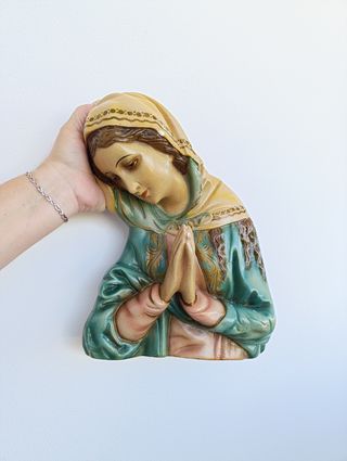 Preciosa escultura de la Virgen María, ideal para colgar en la pared. Es una pieza delicada y decorativa. Tiene algunos esconchones del paso del tiempo. - Material: cerámica. - Colores: dorado y verde azulado.