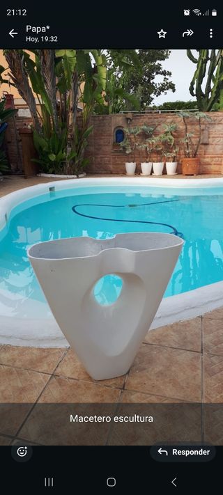 Preciosa maceta con forma de escultura. Es de color blanco y parece estar hecha de piedra. Ideal para decorar tu jardín o piscina. - Diseño elegante y moderno. Tiene una grieta en la pintura que apenas se nota y se puede restaurar