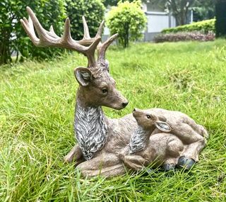 Encantadora figura de un ciervo con su cervatillo, ideal para dar un toque especial a tu jardín o cualquier espacio . 36x17x28 - Diseño detallado y realista. - Tonos marrones y grises que combinan con el entorno.