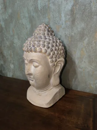 Imponente figura decorativa de la cabeza de Buda, de acabado envejecido en tonos piedra natural. Su diseño transmite calma, serenidad y armonía, ideal para crear un ambiente zen en el hogar, jardín, entrada o zona de meditación. Los detalles tallados del cabello y el rostro aportan realismo y una gran presencia visual. 📏 Medidas: 37 cm de alto x 14 cm de ancho x 21 cm de profundidad 📍 Estado: En muy buen estado, sin daños visibles. #buda #decoración #zen #hogar #relax #espiritualidad #figura #oriental #deco #interiorismo #serenidad #escultura #buddha
