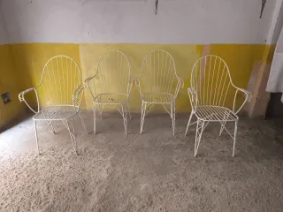 4 butacas de hierro forjado, pintadas de blanco. Primera mitad siglo XX Estructura con un bonito diseño clásico. Respaldo arqueado con cómodos reposabrazos Ideal para un jardín, porche o terraza. Respaldo y asiento ancho super cómodo VDV2839 patio Balcón forja becara Borgia mesa Conti hanbel valenti midcentury zara kave home maison Jansen bagues du monde macetero farola maceta antigüedad barbacoa comedor sillón Ikea fuente escultura figura aluminio corte inglés Segre subasta Fernando Durán escultura tinaja lebrillo cortijo playa mecedora antiguo retro vintage sol sillas midcentury cesca diseño escandinavo nórdico Willy Rizzo olot