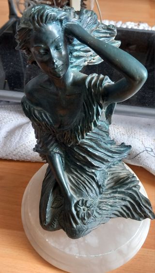Elegante escultura Brisa con un diseño detallado. La figura es en yeso con pátina de bronce envejecido la base es en mármol blanco la base mide 20 cm de diámetro la figura 27 cm.de alto en total con base son 30 cm de alto - Fabricada en metal y piedra. - Tonos teal y blanco.