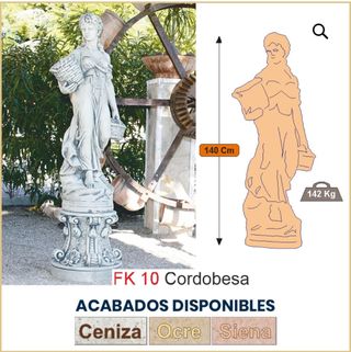 Preciosa escultura de piedra de estilo clásico. Ideal para jardín o espacio exterior. Impone en persona. La cordobesa vale 190€ Pedestal Clásico 45€ Todo 230€ Se fabrican por encargo del color que desees, todos los colores valen lo mismo, se recoge entre Totana y la Hoya - Estatua de 140 cm de alto. - Pesa 142 kg. - Acabados disponibles: Ceniza, Ocre, Siena.