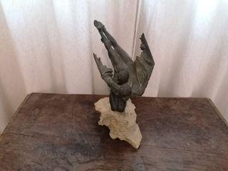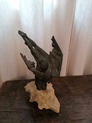 de estilo post modernista realizado en bronce sobre peana de piedra marina . Representa dos figuras entrelazadas alzando el vuelo como dos bailarines. de 1983. Se vende en Sevilla