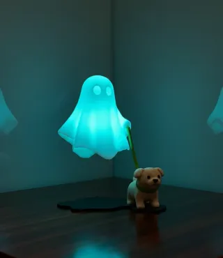 Escultura decorativa con un diseño único. - Figura de un perro con un fantasma. - Base negra con forma de nube.