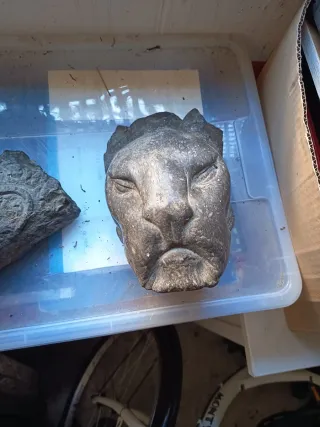 Detalle de escultura en piedra con forma de cabeza de león. - Diseño detallado. - Acabado rústico.