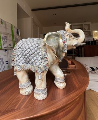 Preciosa escultura de elefante con un diseño muy detallado y ornamentado. Añade un toque de elegancia a cualquier espacio. Objeto adquirido en Londres. Pintado a mano. - Acabados en dorado y plateado. - Detalles en relieve y adornos. - Base estable para exhibición.