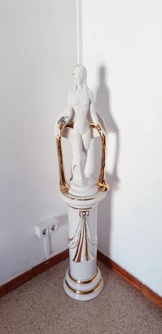 ESCULTURA MUJER DESNUDA SOBRE UN PEDESTAL REALIZADO EN PORCELANA ESMALTADA EN COLOR BLANCO Y DETALLES DORADOS. TIENE UN DESPERFECTO DETRÁS Y EN LA MANO,PERO SE ENCUENTRA ESTABLE Y EN PERFECTO ESTADO. ES DE 1 SOLA PIEZA Y NO SE PUEDE QUITAR LA ESCULTURA. MEDIDAS: ALTO: 1.26 CM ANCHO: 28 CM DIÁMETRO PEDESTAL: 25 CM