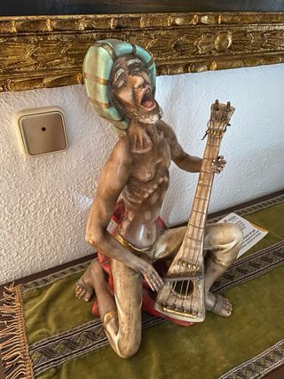 Figura decorativa de un hombre tocando un instrumento de cuerda. - Detallada escultura con expresión facial marcada. - El instrumento simula una guitarra o laúd. - Tonos tierra y detalles en turquesa.