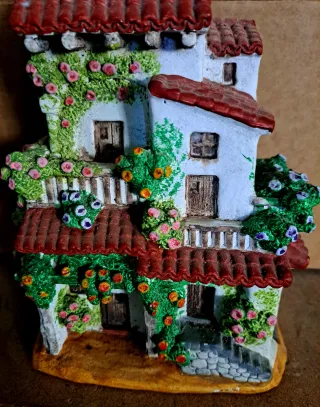 Bonita escultura de terracota pintada a mano, casa con detalles de vegetación y flores. Colección, decoración, belén, Navidad, regalo, artesanía, pintura