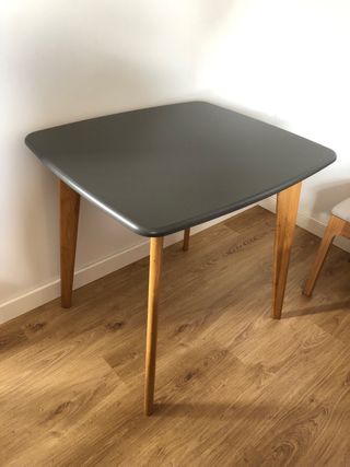 Mesa de comedor con un diseño moderno y elegante. - Tablero en color gris oscuro. - Patas de madera maciza en tono natural. - Bordes redondeados. - Diseño orgánico Dimensiones 71 x 80 x 75