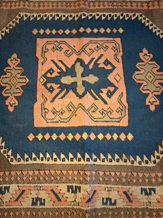 Alfombra decorativa con un diseño geométrico y tradicional. - Medidas: 180 cm de largo por 120 cm de ancho. - Tonos marrones y azules predominantes. - Borde con detalles en color rosa y beige. - Flecos en los extremos.